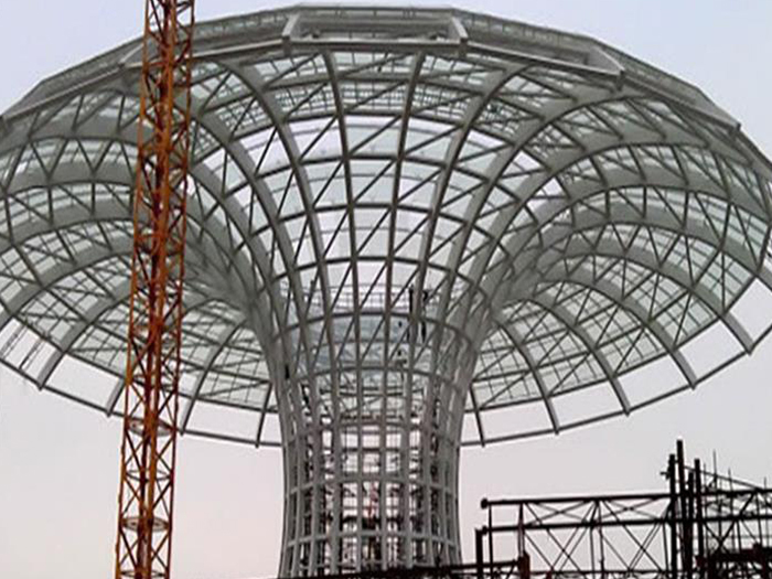 二、球形网架结构因其结构新颖,受力合理,自重轻、用钢量低等优点。如大型体育场馆球形高安螺栓球网架、公共场馆球形网架、电厂高安螺栓球网架、水泥工业球形网架、仓储物流球形网架、高安干煤棚工业球形网架、高安收费站高安加油站球形网架、展览中心、影剧院、商场、航站楼、候车厅、工厂高安车间、仓库、电视塔等球形螺栓球节点网架。国内球形网架结构主要分为:高安焊接球节点网架及螺栓球节点网架两种。螺栓球节点网架其构件工厂内加工量较大,现场安装便捷,适用于现场工期紧,高安施工条件、用电量受制约,网架形状复杂、高安杆件定位困难的异形结构。螺栓球节点球形网架系统基本由高安杆件、螺栓球、支撑支座等组成。按照节点形式可分为交叉高安桁架体系、四角锥体系、三角锥体系等。支撑方式多为固定支座支撑。对于大面积、大跨度及有特殊受力或伸缩要求的网架结构可采用橡胶支座、滑移支座、球铰支座等支撑形式,以满足结构自身的受力稳定、均衡,便于内力释放等设计要求。
